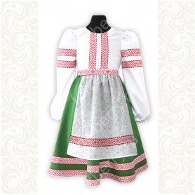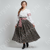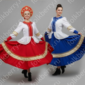 Костюм выполнен из габардина и красиво подобранного декора в золотистых цветах. Достоинства габардина в том, что он не мнется, не блестит, как атлас, ложится красивыми мягкими складками, цвет не выгорает. Юбка с оборкой, декор в золотистых цветах, по талии на двойной резинке. Блуза белого праздничного цвета, с баской, рукава расширены внизу, с манжетами. Сзади на блузе шнуровка. Она дает хорошую посадку по фигуре. Костюм предназначен для творческих сольных и коллективных театральных выступлений.