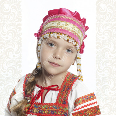 Кокошник выполнен из атласа, декорирован жаккардовой тесьмой, "вьюнком", атласной лентой, бусинами.