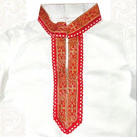 Косоворотка украшена жаккардовой тесьмой и вьюнком, контрастирующей по цвету с основной тканью. В комплекте с изделием идет кушак.