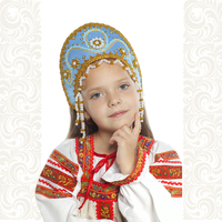 Кокошник выполнен на твёрдой основе, ткань – атлас (креп сатин), декорирован вьюном, тесьмой «завиток»,  а так же бусами, пайетками, и бисером, которые пришиты вручную. Высота изделия составляет над головой 12,5 см, ширина 27 см. Сзади кокошник крепится резинкой и атласной лентой, которая завязывается в бант. Возможно корпоративные сочетания цветов и нанесение Вашего логотипа.