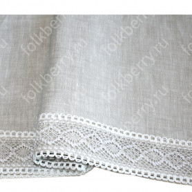 Платье. Сшито из умягченной льняной ткани белого цвета, декорировано красным кружевом, серебристой тесьмой и бархоткой. Длина – до пят. Крой слегка расклешен к низу. Верх собран на резинку, украшен натуральным хлопковым кружевом. Рукав «реглан» со съемными красными манжетами. Имеется пояс.