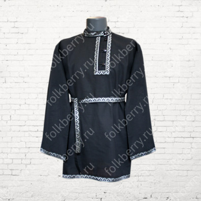 Косоворотка – традиционная русская рубаха. Модель «Народная» черного цвета изготовлена из натуральной хлопковой ткани, укомплектована кушаком. Благодаря черному цвету косоворотка смотрится не только традиционно, но очень современно и стильно, поэтому ее часто покупают. Некоторые элементы рубахи, в том числе пояс, украшены узорчатой тесьмой.