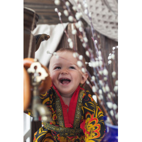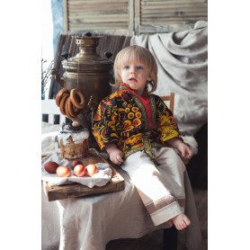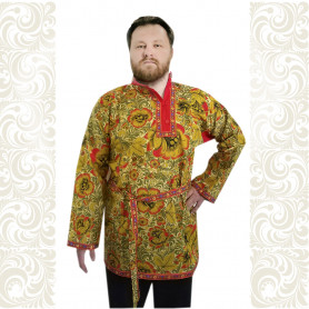 Рубаха торжественно белого цвета с яркой вставкой узора «хохлома» желтого цвета на синем фоне, который обрамляет горловину, концы рукавов и низ изделия. Рисунок напечатан несмываемой краской и не полиняет после многократных стирок.