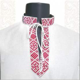 Ткань - лен небеленого цвета, плотный, мягкий, качественный. Декор, жаккардовая тесьма шириной 3 см, располагается, согласно традиции, вокруг шеи, по груди с левой стороны, на рукавах, поясе, по низу косоворотки.