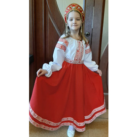 Костюм  выполнен из габардина и красиво подобранного декора в золотистых цветах. Достоинства габардина  в том, что он не мнется, не блестит, как атлас, ложится красивыми  мягкими складками, цвет не выгорает. Юбка  с оборкой, декор в золотистых цветах, по талии на  двойной резинке. Блуза  белого праздничного цвета, с баской,  рукава расширены внизу, с манжетами.   Сзади на блузе шнуровка. Она дает хорошую посадку по фигуре. Костюм предназначен для творческих  сольных и коллективных театральных выступлений.