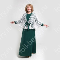 Костюм выполнен из парчи бело-серебристого цвета. Костюм декорирован искусственным мехом белого цвета. Застежка - потайные кнопки. Силуэт - приталенный, сзади кулиска для регулировки талии. Красивый пышный рукав. Отделка - серебристая ажурная тесьма. Длина шубки по спинке 93-98 см (от седьмого шейного позвонка до низа изделия).