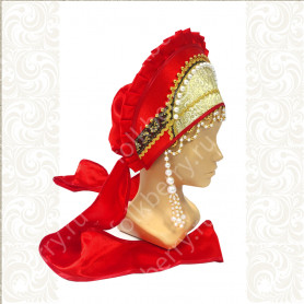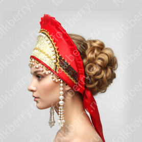 Костюм  выполнен из габардина и красиво подобранного декора в золотистых цветах. Достоинства габардина  в том, что он не мнется, не блестит, как атлас, ложится красивыми  мягкими складками, цвет не выгорает. Юбка  с оборкой, декор в золотистых цветах, по талии на  двойной резинке. Блуза  белого праздничного цвета, с баской,  рукава расширены внизу, с манжетами.   Сзади на блузе шнуровка. Она дает хорошую посадку по фигуре. Костюм предназначен для творческих  сольных и коллективных театральных выступлений.