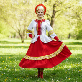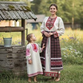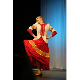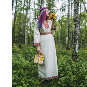 Платье нежного красивого голубого цвета универсальное, т.к. хорошо садится по фигуре, благодаря регулируемой горловине, рукаву реглан, наличию длинного пояса. Юбка (почти солнце) длиной немного ниже колена эффектно смотрится в танце. Талия слегка завышена. Декор платья - жаккардовая тесьма с обережными символами. Платье сшито из габардина, матовой, немнущейся ткани ярких цветов.