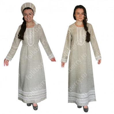 Платье "Таруся" выполнено из мягкого натурального льна благородного серебристого цвета, декорировано натуральным кружевом. Классический стиль, длина - миди, оригинальный полупояс и вытачки на спине мягко подчеркивают линии силуэта, длинный втачной рукав украшен кружевом.