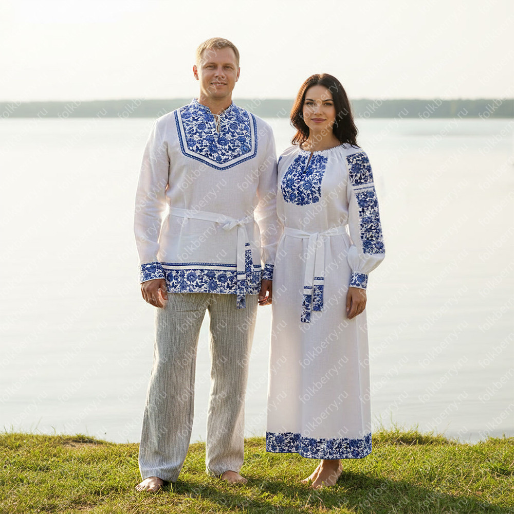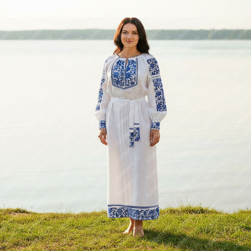 Платье изготовлено из умягченного белого льна и украшено жаккардовой тесьмой с узорами Гжель и белым кружевом разной ширины, а также бархоткой и изысканной серебристой тонкой тесьмой. Платье силуэта А, расклешено к низу. В комплект входит пояс с веревочками на концах. Рукава - удобный реглан, также декорированы кружевом и жаккардовой тесьмой. Платье немного просвечивает, желательно надевать с легким подъюбником или юбкой-поневой.
