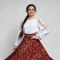 Юбка сшита из ажурного шитья, состоит из трех прямоугольных полотен, соединенных на поясе, украшена красным кружевом, бархоткой в тон, а также блестящей серебристой тесьмой.
