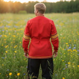Рубаха мужская «Истоки» с коротким, втачным рукавом выполнена из белого льна. Ворот, рукава, низ изделия оснащены декором из жаккардовой тесьмы с традиционными славянскими обережными узорами. Модель комплектуется поясом (кушаком) из ткани с тесьмой.