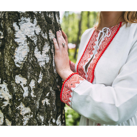Сарафан декорирован широкой полосой  жаккардовой тесьмы, блестящего шнура, вьюнка, кружева, что придает изделию дополнительные красоту и торжественность.