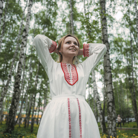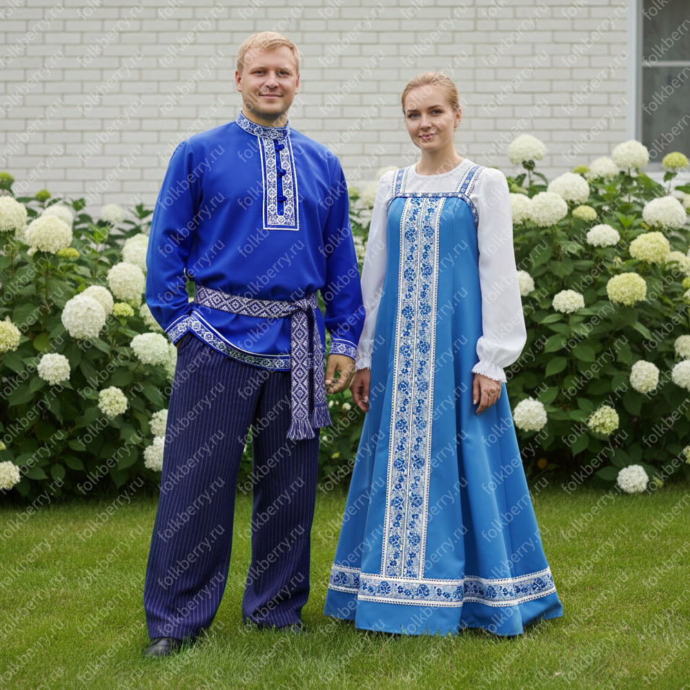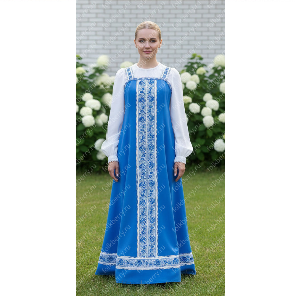 Сарафан с блузой Красна девица в голубом цвете – очень женственная модель русского сарафана. Вверху сарафан идеально облегает грудь, мягко облегает  талию, плавно расклешается до 3 метров в диаметре внизу.
