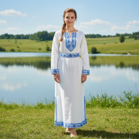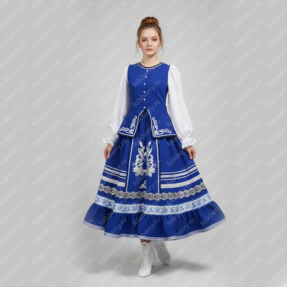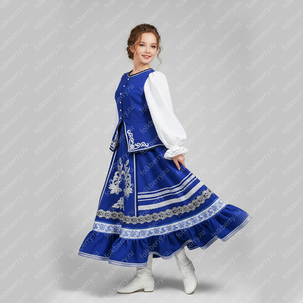 Костюм Казачий женский "Женский танцевальный костюм Катюша, габардин, синий" - традиционный женский костюм казаков, состоящий из блузы и юбки.